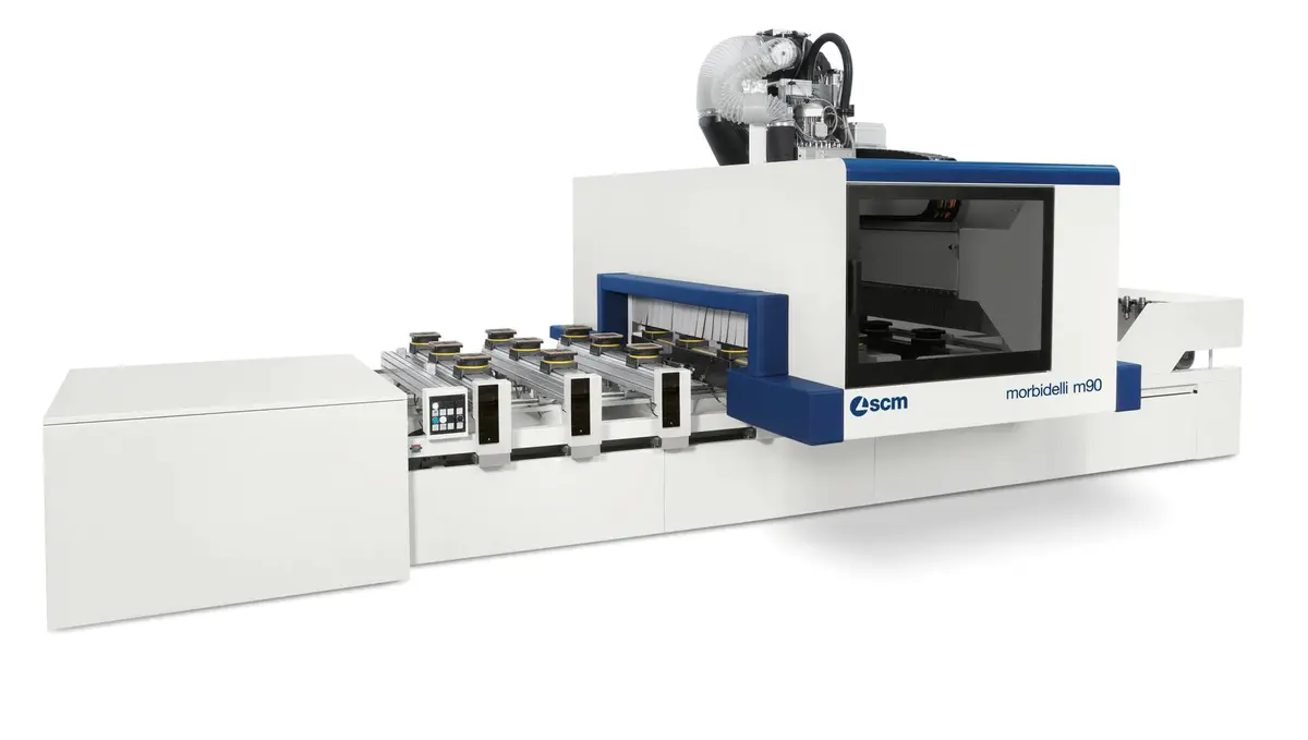 Morbidelli M90 by SCM, a new router with a 60" x 144" table, 21 hp power, 24,000 RPM, 3-axis control, and 9.84" Z travel. Ideal for high-precision tasks.